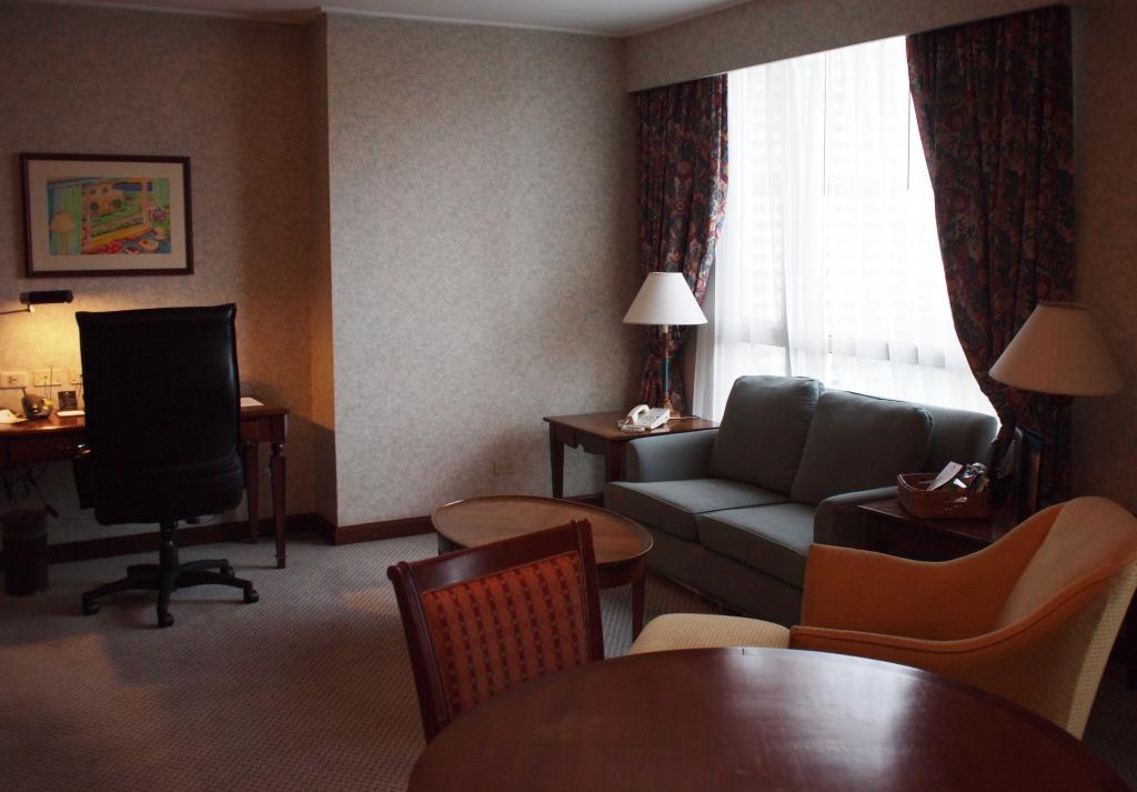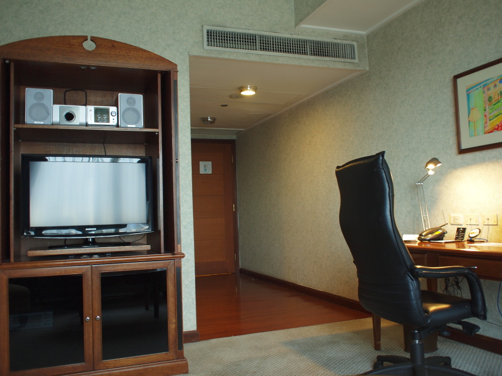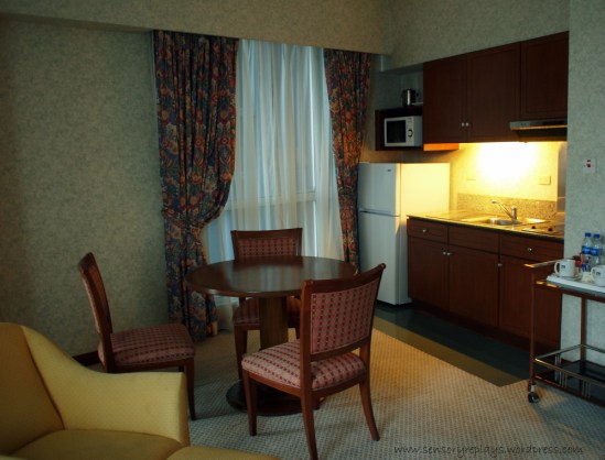 i chose their one-bedroom suite that has a living room and a dining room. i got a room at the tenth floor, 1001. there is a home theater system, a fully serviced kitchen and a dining table then a working desk with an ergonomic chair is also included in the room. internet access is available upon request – as usual with an extra charge.