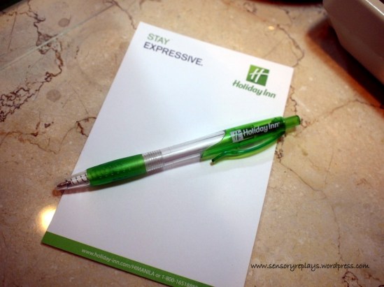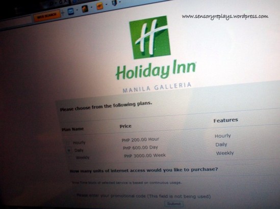 a work space is provided in the room. high-speed internet access is available for additional charges, most hotels in manila does this for they know it is a necessity for business travellers, even an ordinary guest to have a net connection inside the room. at holiday inn, i think P600.00 is a rip-off to charge guests specially for an average balikbayan like me who checks in and pays from my own pocket. i wouldn’t pay for that amount and would rather use my mobile phone for internet if that is the case. some hotels do have wireless connections as complimentary, but not this one.