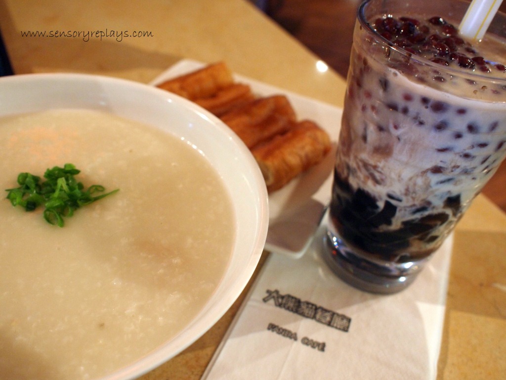 i ordered some seafood congee with deep-fried rice flour pastry and red-bean and jelly milk drink.