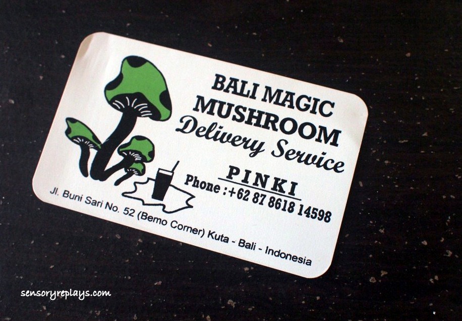 after we finished lunch, we walked around kuta passing by more stores and bars. there was one thing that caught my attention for we were getting offered of “magic mushrooms”. i took a picture of a calling card for “delivery service” for these stuff.