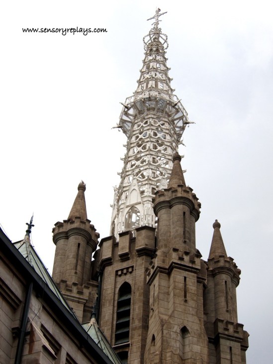 the cathedral is buit in neo-gothic style and was consecrated in 1901. there are three main spires where the two tallest ones measured 60 metres tall and are located in front on each side of the portal.