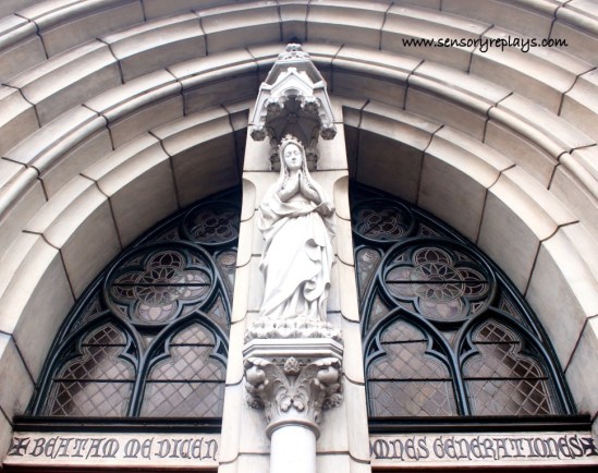 there is a statue of mother mary in the main entrance and a sentence written in latin: “beatam me dicentes omnes generationes” which means “all generations shall call me blessed”.