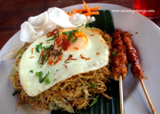 i chose to order their bakmi goreng jawa, a dish of stir-fried egg noodles cooked in javanese spice paste with shredded chicken and vegetables topped with fried egg with a side dish of pickled mixed vegetables and two sticks of chicken satay.