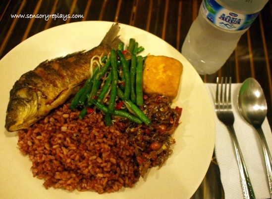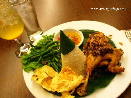 i ordered “ayam betutu”, half chicken grilled with traditional balinese spice, served with steamed rice, sambal matah, and piecing kacang panjang.  the dish was beautifully presented though the food itself, i can consider as average.