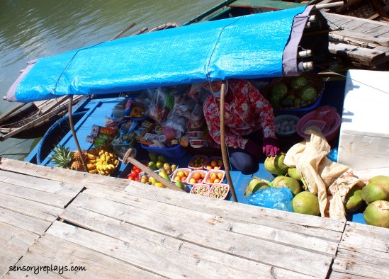 we were served lunch and stopped by in one small fishing village. i took a picture of one local woman selling some fruits and vegetables from a wooden boat.