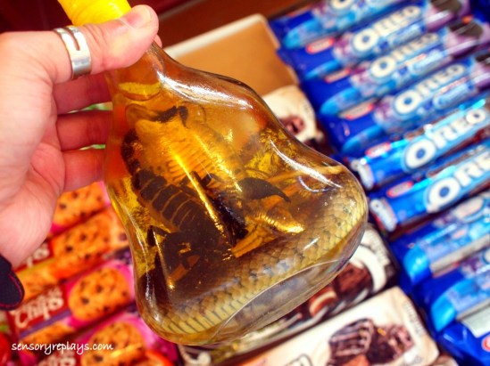 this snake and scorpion wine was along the oreos and other chocolate cookies in the snack bar of the restaurant. it is actually fermented rice liquor (plus a preserved dead snake and scorpion, lol!) and is supposedly health beneficial.