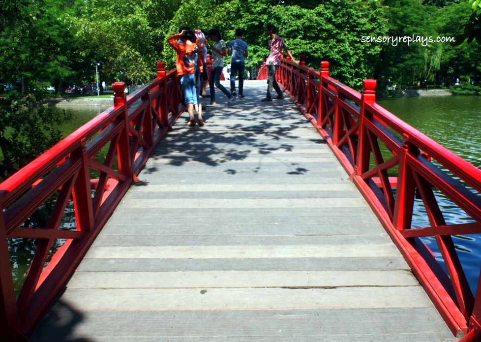 the welcoming morning sunlight bridge (cau da huc) is a red wooden bridge that connects a small islet in the lake to the shore.