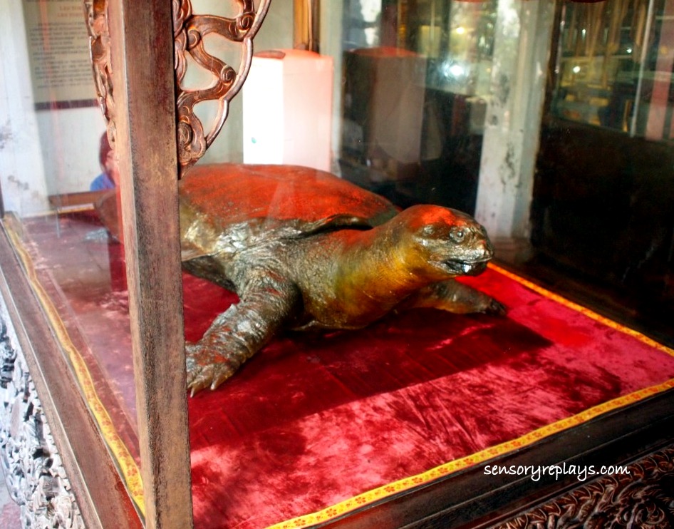 a preserved specimen of the hoan kiem turtle is on display in the temple.  these endemic, soft-shelled turtle specie was known before to be extinct but was then found out that there is one elusive female that still thrives in the lake.
