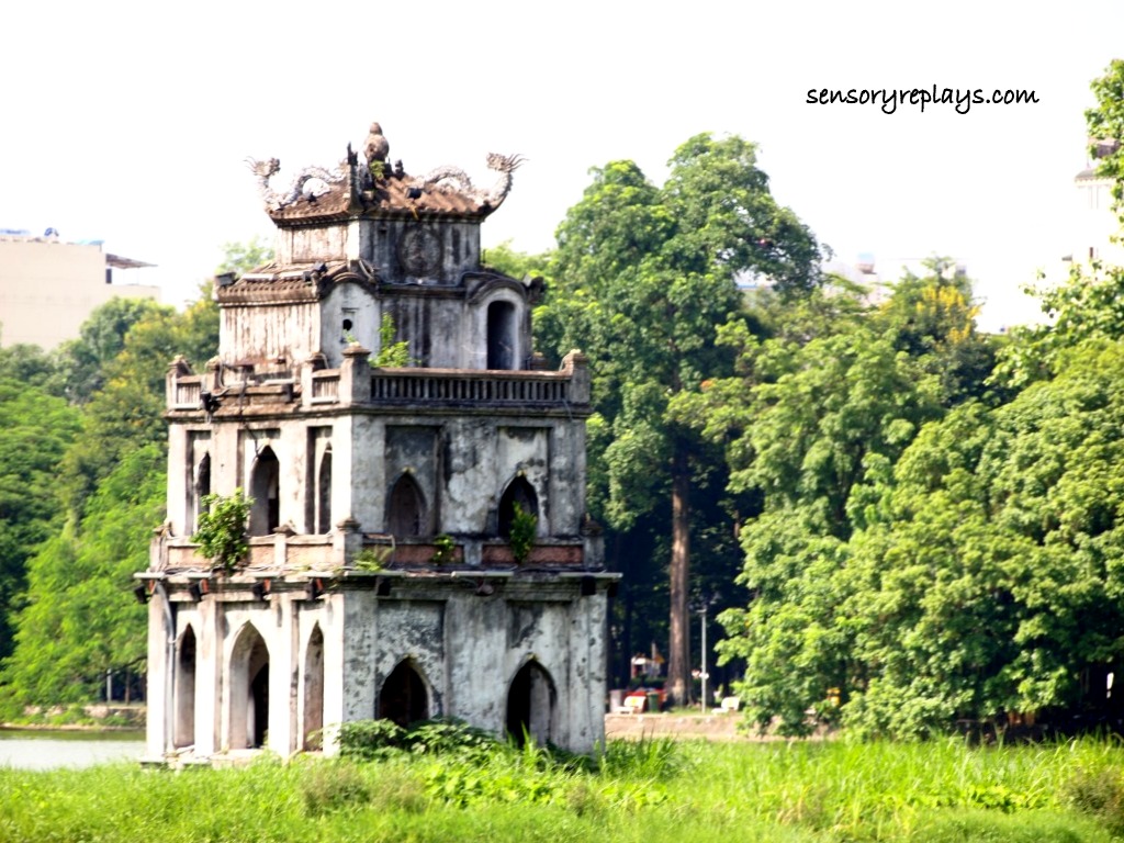 the turtle tower, a small pagoda erected at an islet in the middle of the lake.
