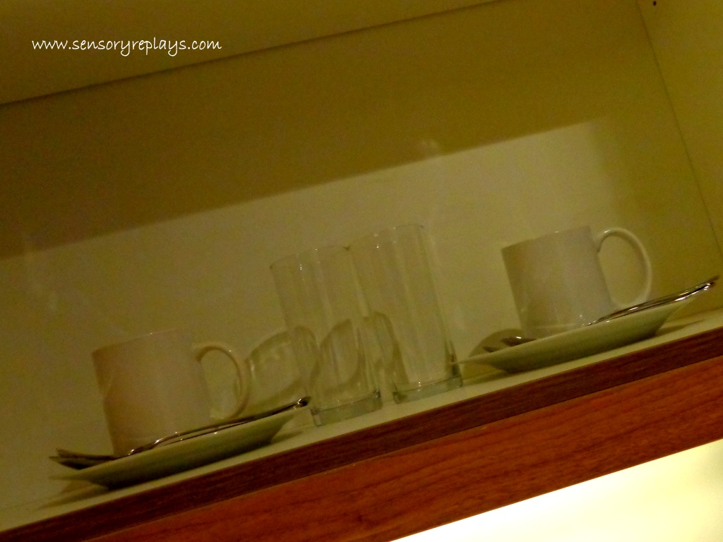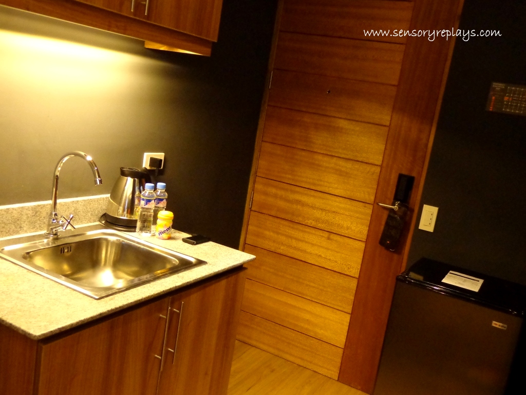 a sink with a water boiler and the fridge, also some bottled distilled water.  no complimentary coffee/sugar sachets or tea bags (the mentos dragees are mine!).