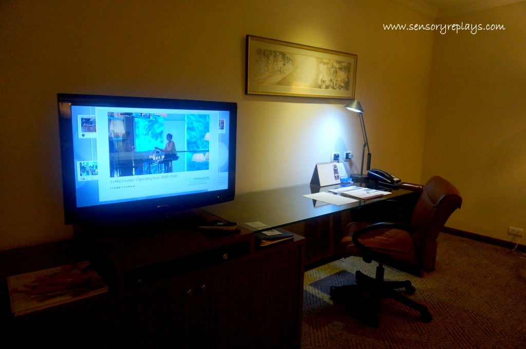 a spacious work desk, 32-inch LCD flat screen television and dining area.