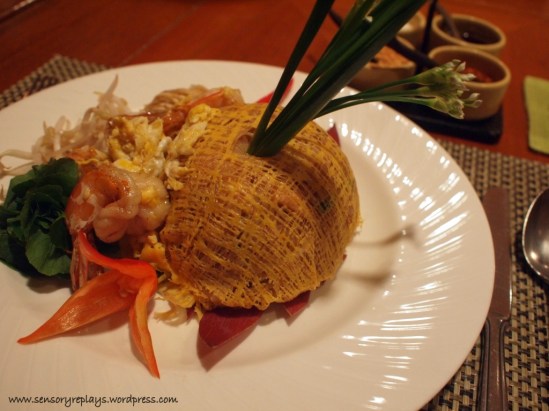 i ordered one of their appetizer vegetarian specialties, poh pia je (vegetarian spring rolls) and their pad thai goong sod hor kai (fried noodles with king prawns wrapped in omelet).